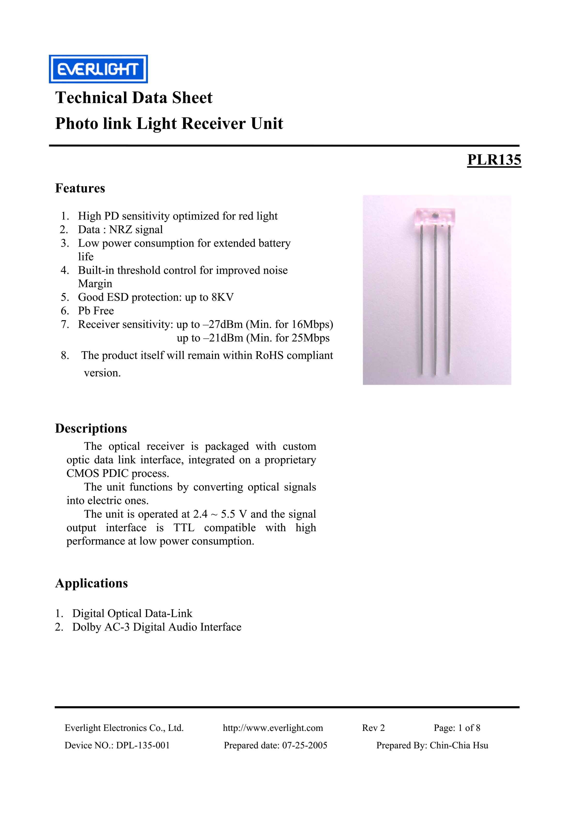 亿光光纤接收器PLR135传输器参数及规格书(PDF 数据表)