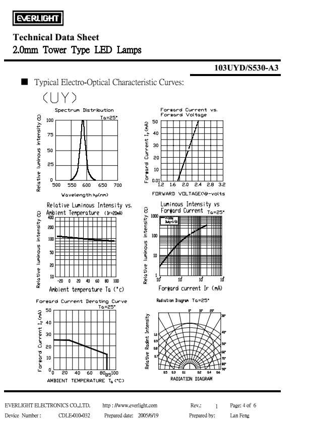亿光直插2mm发光二极管103UYD-S530-A3参数及规格书(PDF 数据表)